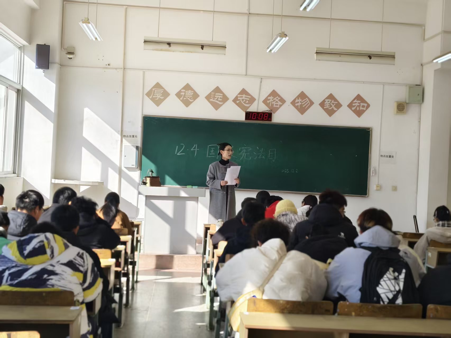 各班级在班主任的带领下召开“宪法晨读”主题班会。PPT 化繁为简,条文逐句领读,案例直击痛点,竞答点燃氛围;从实验室安全到网络维权,宪法被翻译成最贴近青春的“方言”。同学们晒观点、辩权责,笑声与掌声此起彼伏。一场班会下来,宪法成为了触手可及的“护身符”,在为我们每一次呼吸站岗。