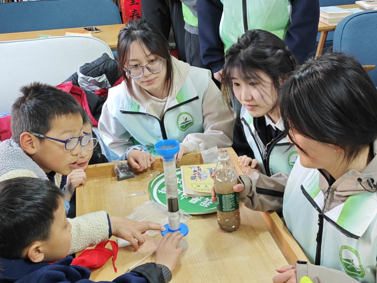 活动的高潮是水质监测体验环节。在志愿者的指导下,孩子们化身“小小水质监测员”,首先利用纱布、石英砂、活性炭等材料搭建简易过滤装置,对采集的模拟受污染水样进行初步净化。孩子们小心翼翼地倾倒水样,观察浑浊的水如何一层层“变清”,直观感受过滤的神奇效果。
